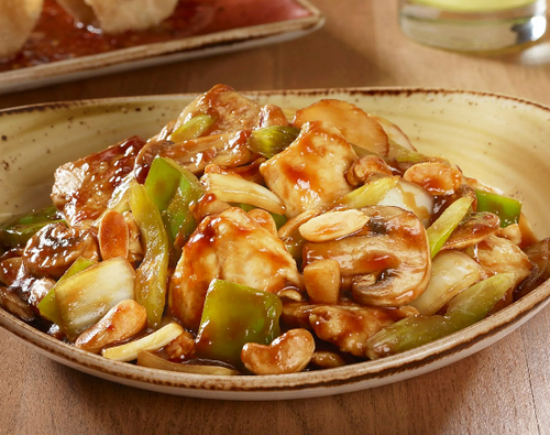 Pechuga de pollo rebanada y salteada con maní, apio, chile...