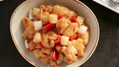 Trozos de pollo tempura salteados con piña, chile dulce y...
